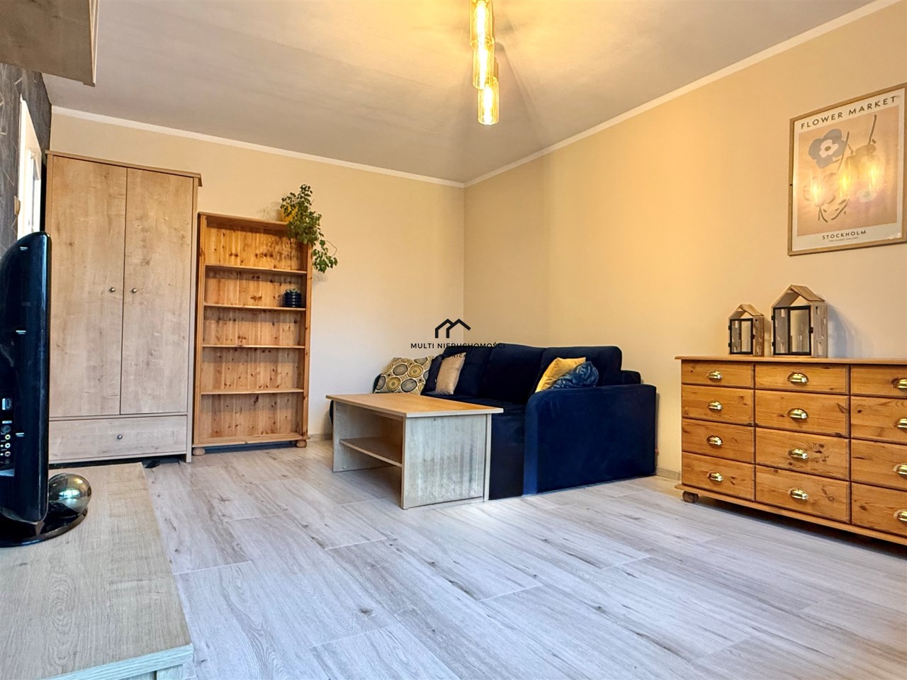 pokój dzienny i sypialnia: narożnik z funkcją spania, ława kawowa, łóżko, regały, szafy, TV, szafka RTV, komody